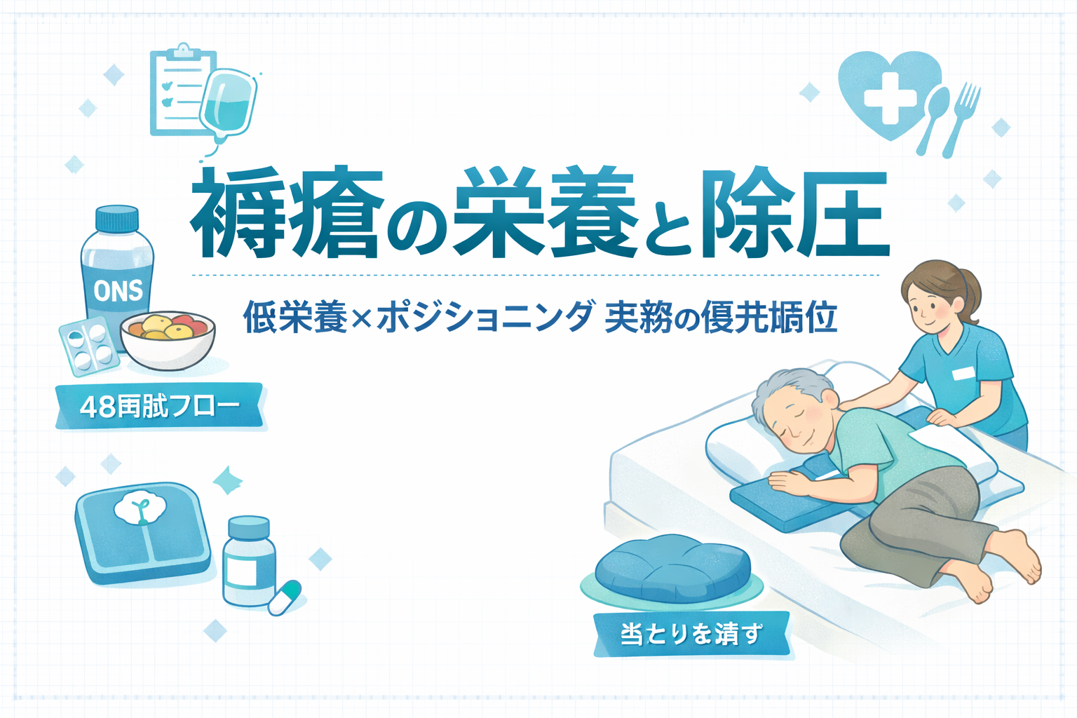 本記事は、褥瘡ハイリスク/褥瘡ありの患者に対して、栄養(入口と目安)除圧(最小要件)同時に回すための運用だけに絞って整理します。
