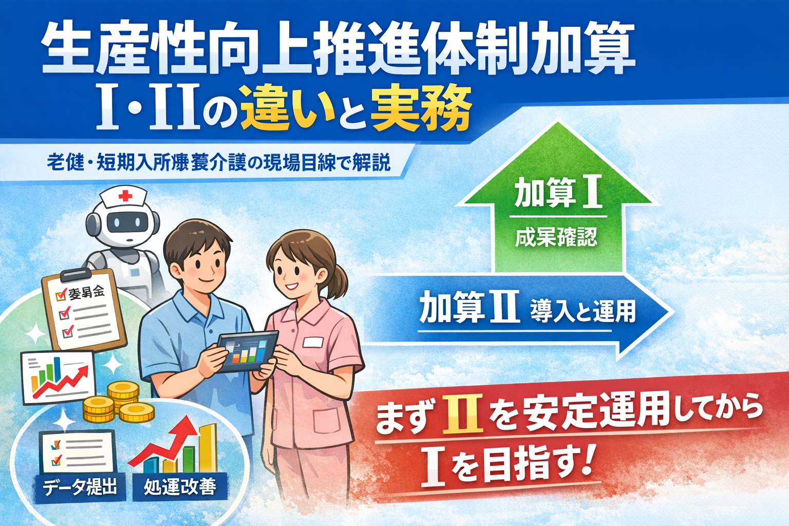 生産性向上推進体制加算は、介護ロボットや ICT などのテクノロジーを導入し、委員会・安全対策・継続的な業務改善まで回している事業所を評価する加算です。結論からいうと、老健では最初から I を狙うより、まず II の要件を安定して回し、記録とデータ提出の型を作ってから I を目指す方が進めやすいです。