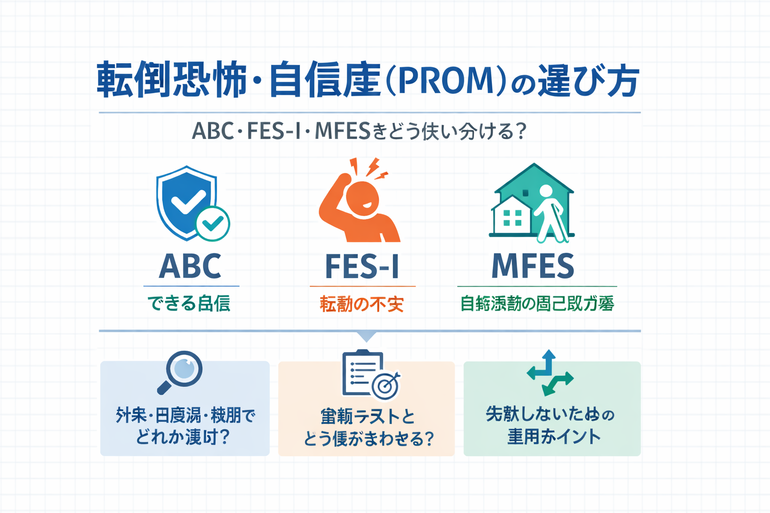 転倒リスクの評価で迷ったら、最初に決めるべきは「何を測りたいか」です。歩行能力(できる/できない)ではなく、本人の主観(自信・不安)を扱うのが PROM(患者報告アウトカム)です。結論として、“できる自信”を見たいなら ABC スケール、“転ぶかも”という不安を見たいなら FES 系の考え方が基本線になります。