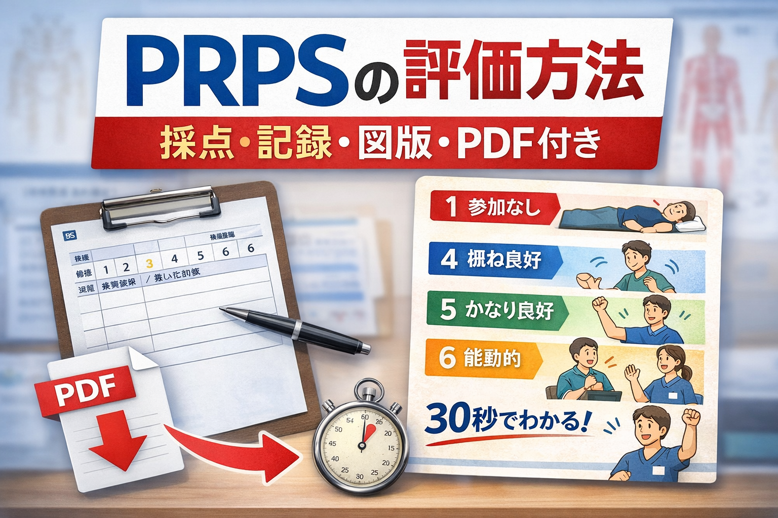PRPS( Pittsburgh Rehabilitation Participation Scale )は、そのセッションでどれだけ参加できたかを、療法士の観察で 1〜6 に評定するシンプルな尺度です。自己記入ではなく観察でそろえやすいのが強みで、 PT ・ OT ・ ST の申し送りを「何となく参加が低い」から「今日は 4、午後は疲労で 2 に落ちる」のような共通言語に変えやすくなります。