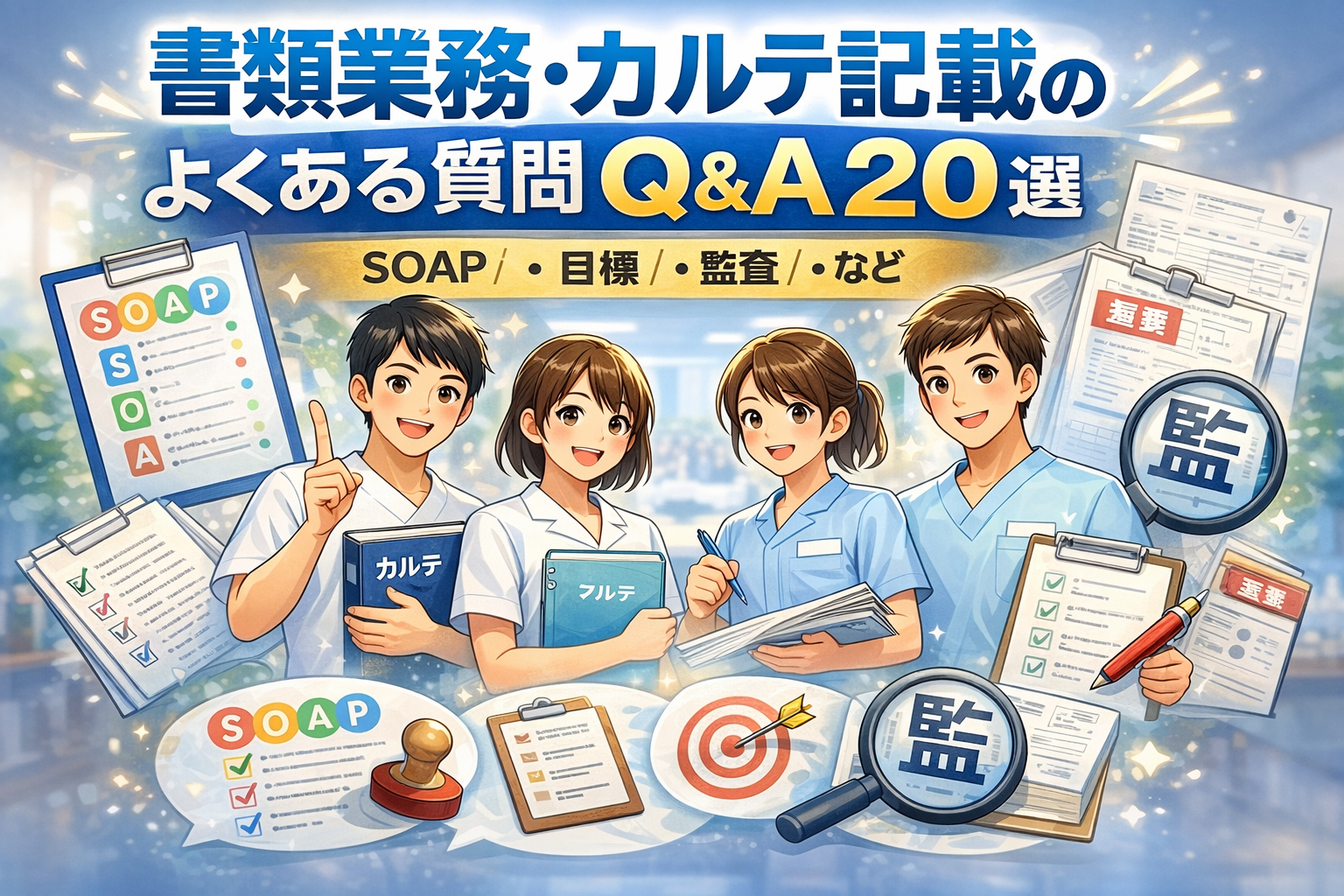 理学療法士の書類業務は、知識よりも「同じ順番で書く」だけで負担が激減します。本記事は「 SOAP が長い」「目標が書けない」「監査が怖い」などの悩みを、現場で使える答えにまとめた Q&A 集です。