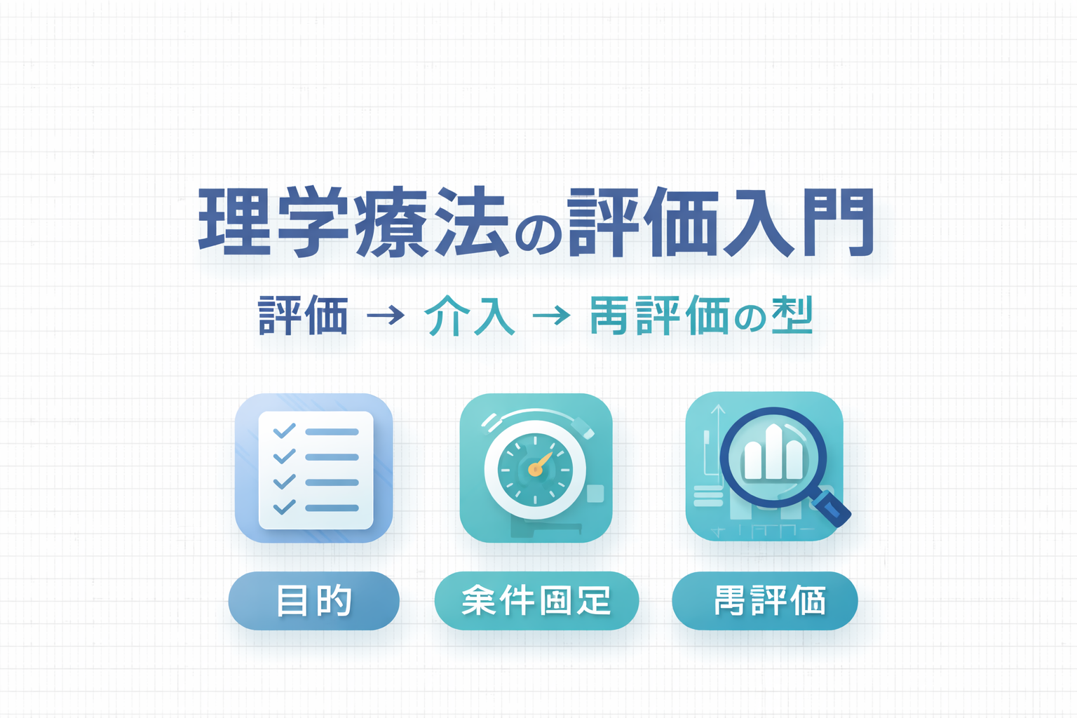 理学療法の評価は、テストやスケールを “ 集める ” 作業ではなく、介入の優先順位と再評価の基準を先に決めるための工程です。本記事では、初回から再評価までを迷わず回せる型として「評価→介入→再評価」を 1 本にまとめます。