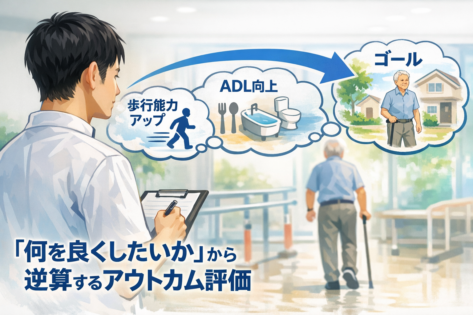 アウトカム評価を選ぶときは、まず「今回いちばん良くしたいもの」を 1 つ決めます。歩行自立を目指すのか、病棟内 ADL を安定させるのか、退院後の生活を回せるかを見たいのかで、主役にする尺度は変わります。ここが曖昧だと、評価が増えるわりに結論が出にくくなります。