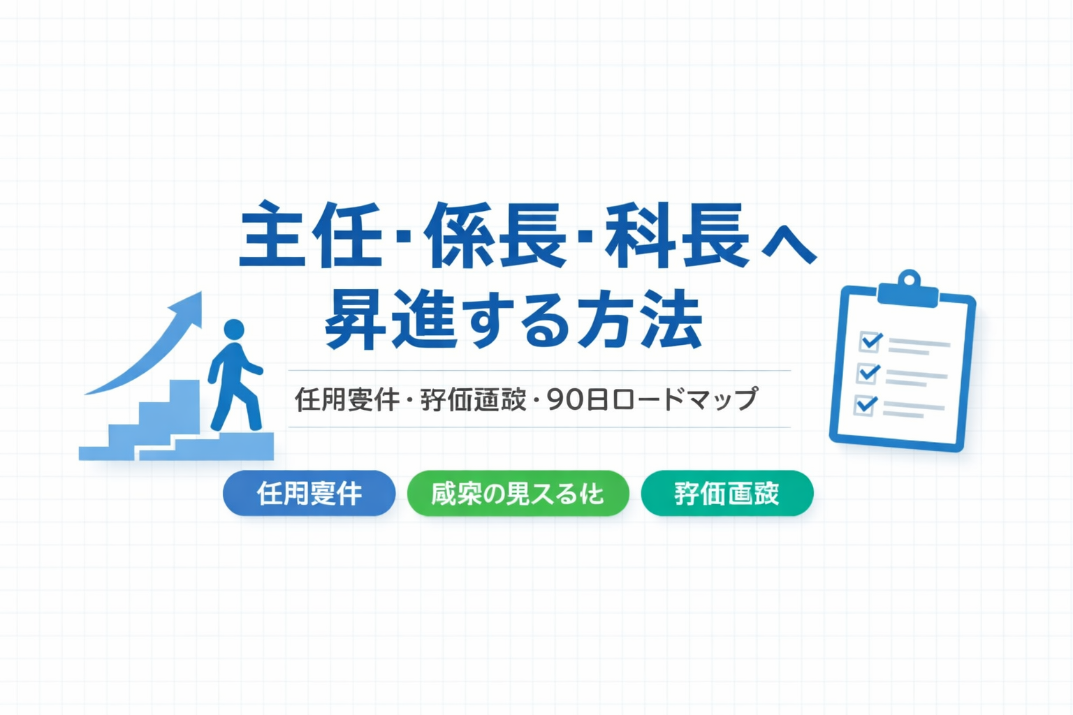 主任・係長・科長などの昇進は、年収や裁量の拡大につながる一方で、「何をすれば評価されるのか」が曖昧なまま走りやすい領域です。本記事では、院内の任用要件を確かめたうえで、 90 日で “評価される成果” を積むための実行手順を、現場のやり方に落とし込みます。