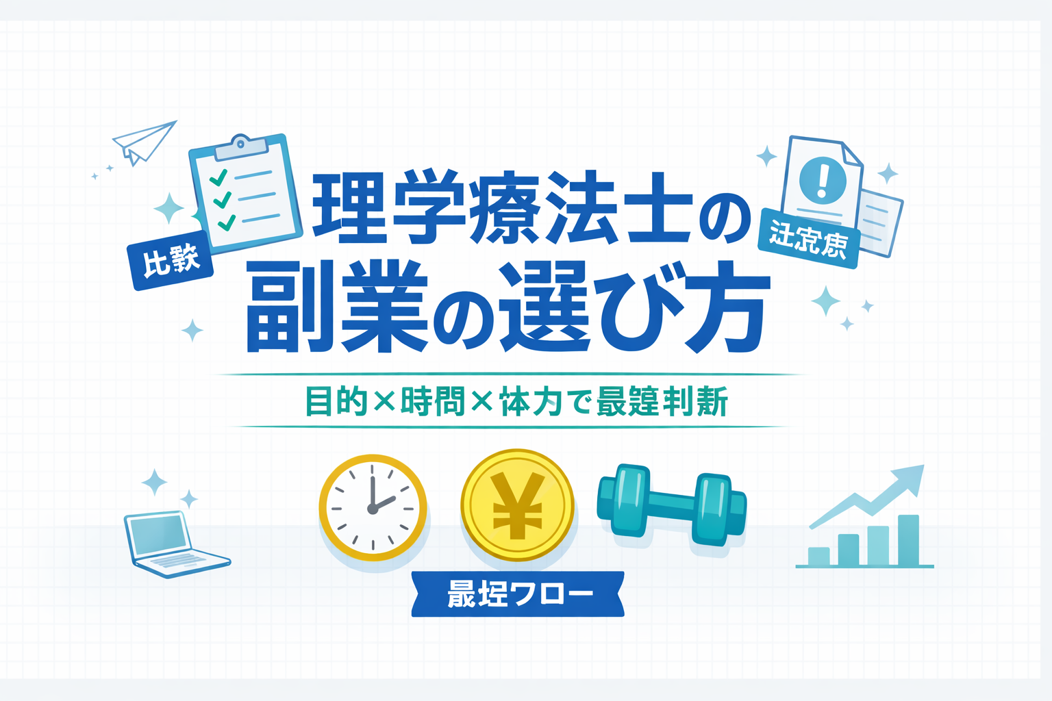 理学療法士( PT )の副業は、いきなり「何が稼げるか」から選ぶとズレやすいです。結論はシンプルで、目的(今月の手取り / 将来の選択肢)、使える時間(週に何時間)、体力(本業への影響)の 3 点で決めると失敗が減ります。