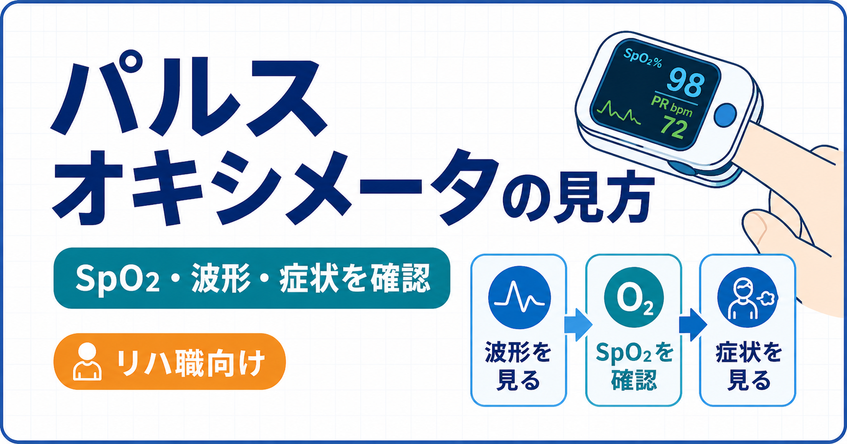 パルスオキシメータは、動脈血酸素飽和度の推定値である SpO2 と脈拍数を非侵襲的に確認できる医療機器です。リハビリ場面では、離床、歩行練習、呼吸リハ、運動負荷、吸引・排痰前後の変化を把握するために使われます。