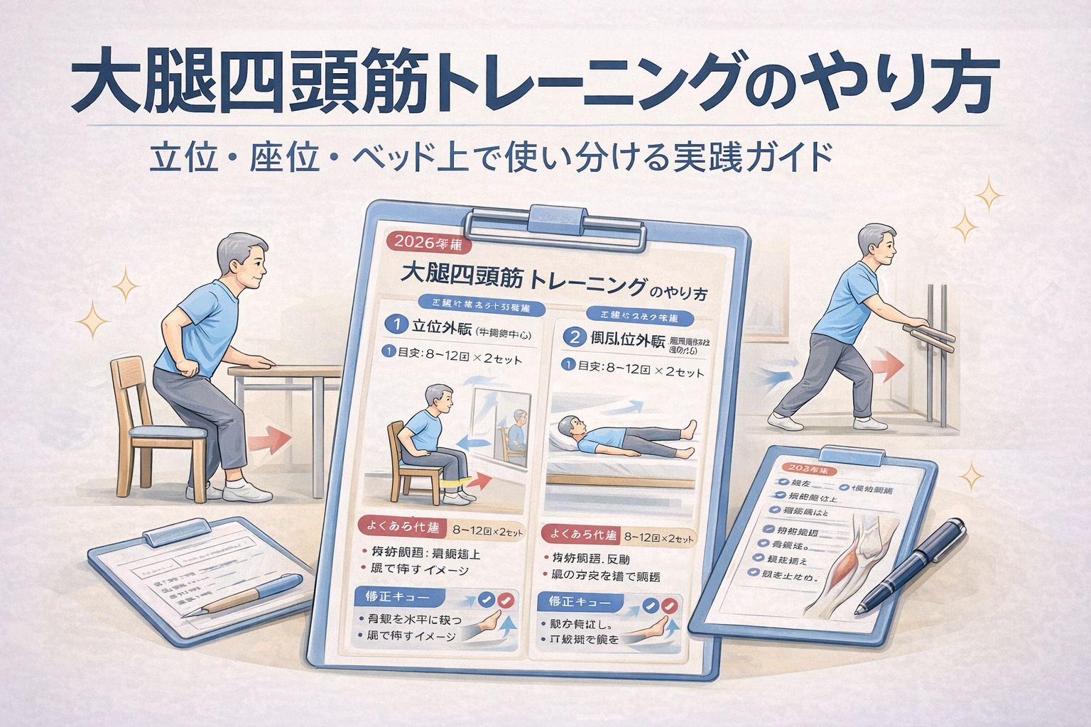 大腿四頭筋トレーニングは、同じ「膝を伸ばす運動」でも、患者さんの実施姿勢(立位・座位・ベッド上)によって負荷量・安全性・代償の出方が変わります。現場で迷いを減らすコツは、姿勢ごとの目的を先に固定し、フォームと記録を同時に回すことです。