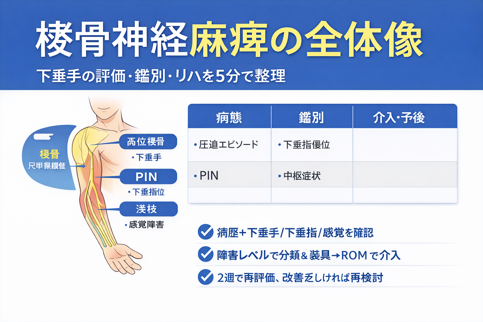 | PIN 障害 | 下垂指優位 | 感覚温存が多い | 部位同定を強化 |