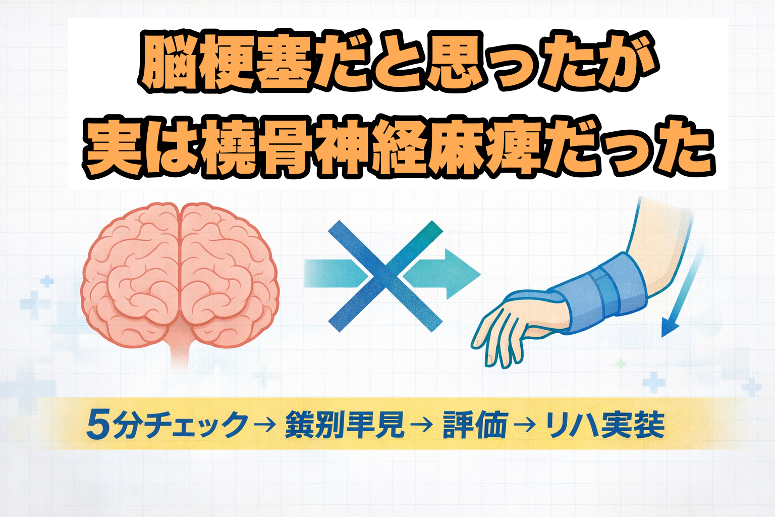 「脳梗塞でリハ開始」と聞いて介入した患者様が、実は 橈骨神経麻痺 だった。こうした経験は、急性期・回復期・外来のどこでも起こり得ます。上肢の使いにくさは中枢でも末梢でも起こるため、先入観だけで進むと評価の抜けが生まれます。