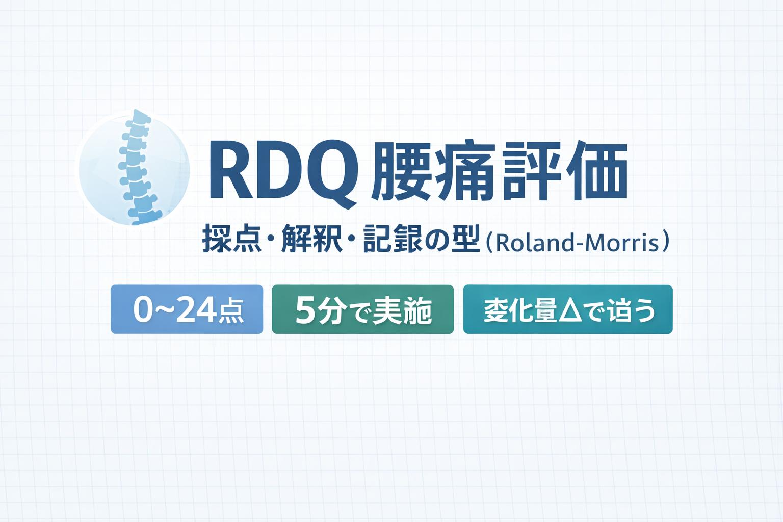 RDQ は「点数」より、同じ条件で測って “変化量( Δ )” を追うと臨床判断が速くなります。 評価 → 記録 → 再評価の流れを 3 分で確認する