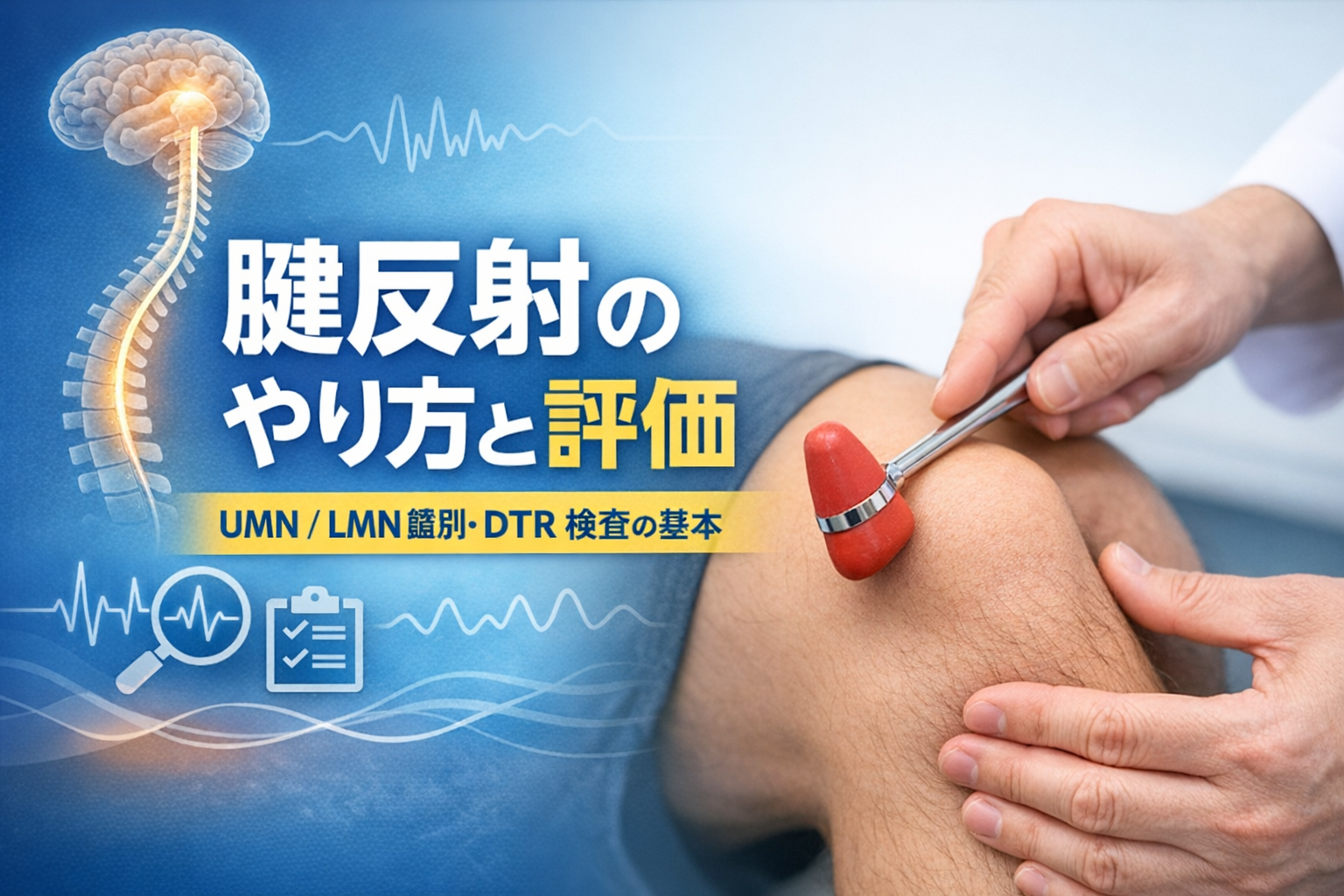 本稿では、腱反射のやり方(実施環境・打鍵のコツ)から、深部腱反射の種類、病的反射、 UMN / LMN 鑑別、反射検査の評価用紙・書き方(記録テンプレ)までを順に整理します。院内標準化や学生・新人教育で、そのまま共有しやすい構成を意識しています。