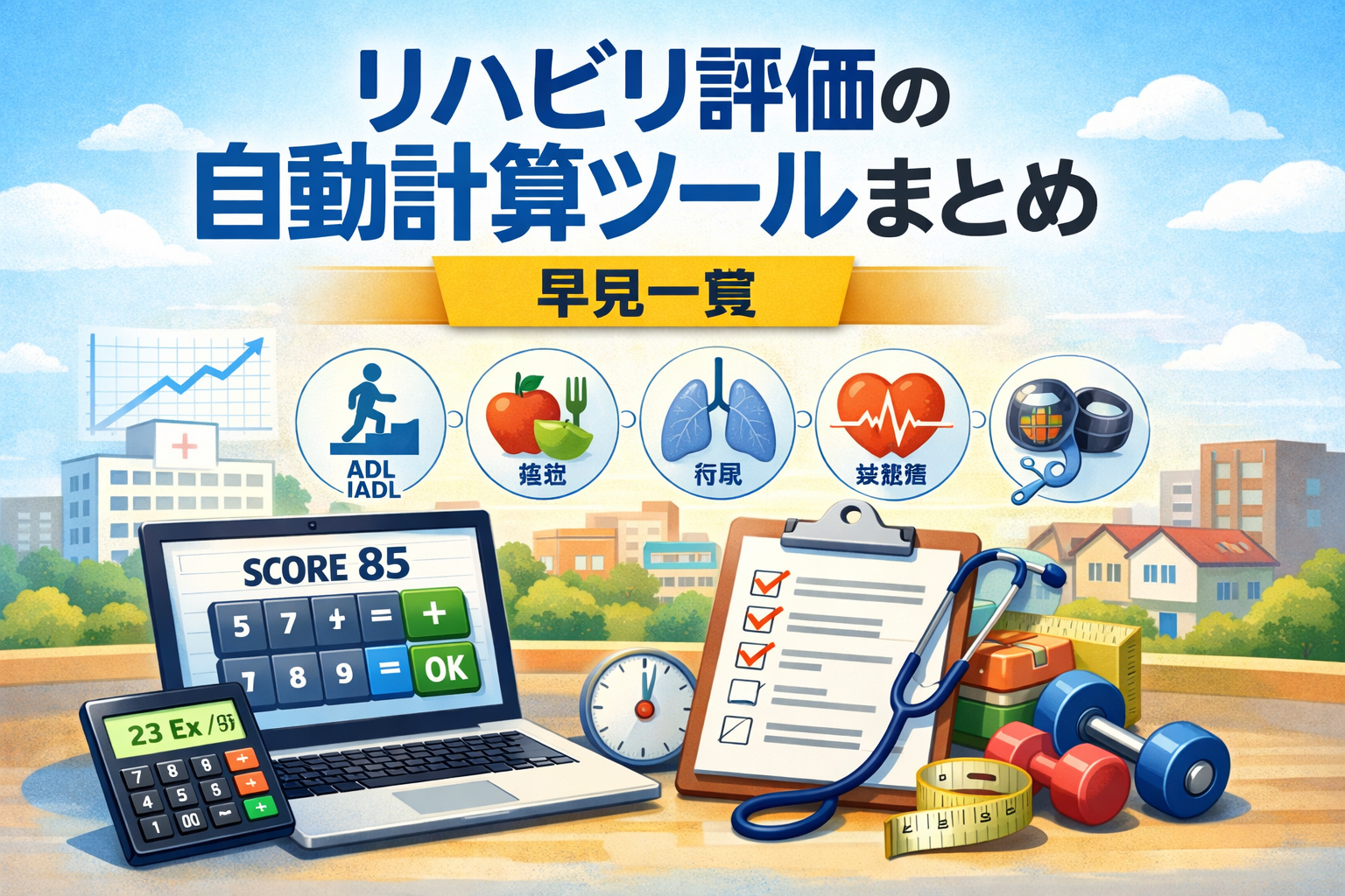 このページは、rehabilikunblog で公開している自動計算ツール系コンテンツを、目的別に探しやすく整理した索引ページです。ADL ・ IADL、栄養、呼吸、活動量など、臨床で「いま計算したい」場面に合わせて、対応記事へたどり着きやすい形でまとめています。