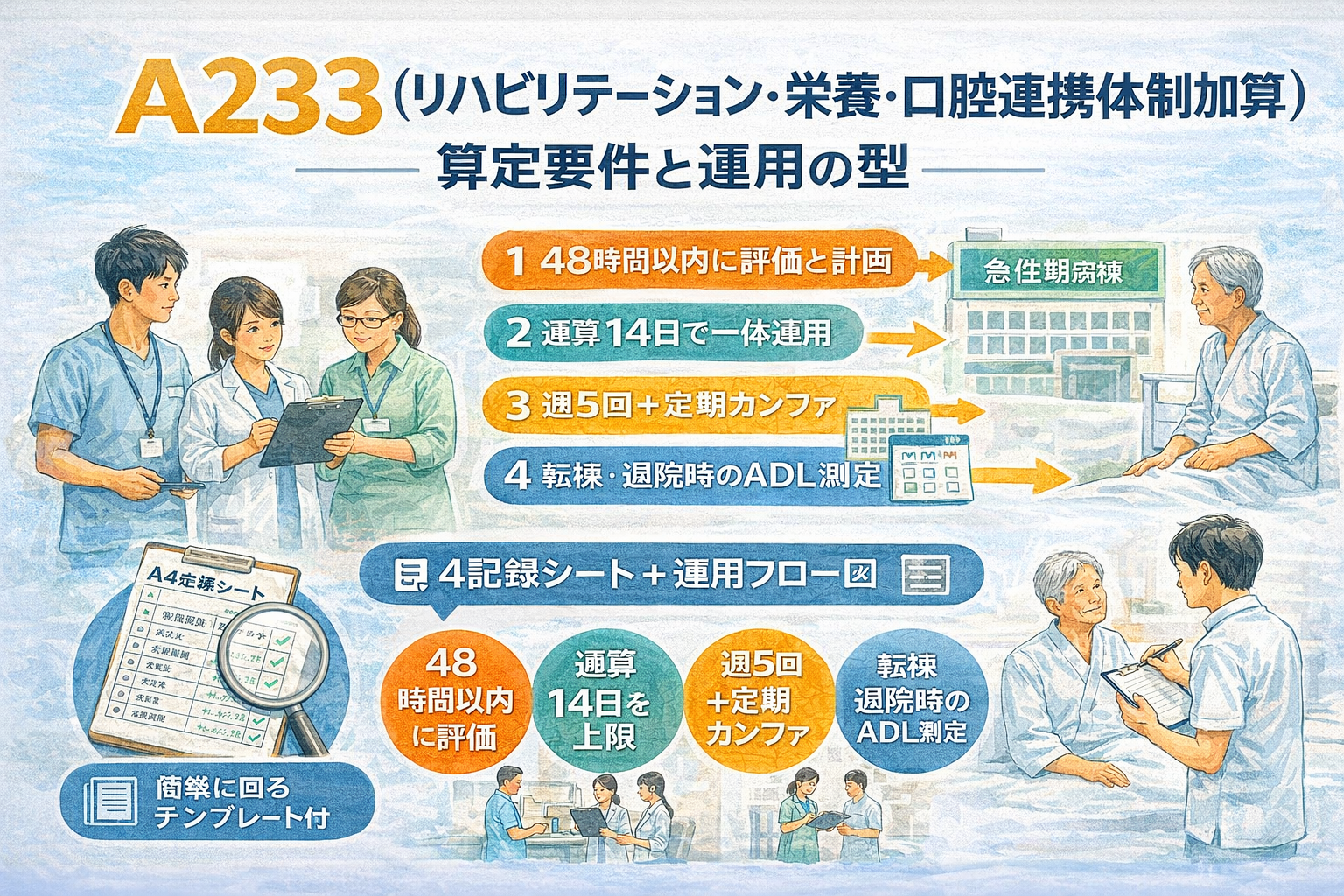 このページで答えるのは、A233 単独の算定要件、対象病棟、人員配置、週 5 回観察、転棟時 ADL 測定、監査でぶれにくい記録の型です。あわせて、現場でそのまま使いやすい A4 記録シート PDF と、全体像をひと目でつかみやすい 運用フロー図 も掲載しています。一方で、A304 / A308-3 との制度比較や 2026 改定の全体整理 は兄弟記事に譲り、ここでは「現場で回す順番」に絞って解説します。