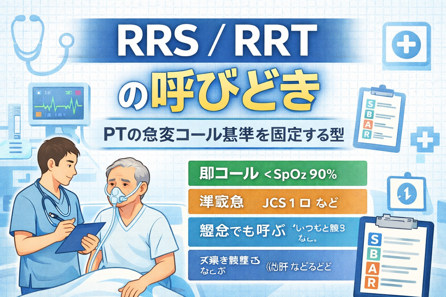 RRS / RRT の本質は「専門チームが来る」ことよりも、①呼ぶ基準、②呼び方、③呼んだ後の流れを揃えて、院内の対応を早くすることです。リハ場面では、とくに「離床中の違和感」「介入後の悪化」「酸素や循環が不安定」など、グレーな状況で力を発揮します。