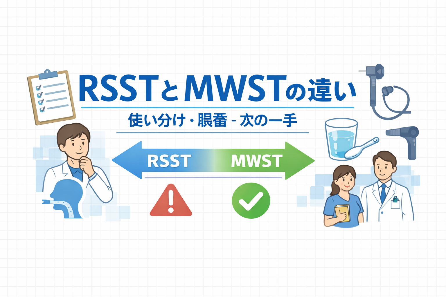 迷いやすいのは「どちらが優れているか」ではなく、どちらを先に行うか、どこで止めるか、陽性のあとに何をつなぐかです。嚥下評価の全体像は 摂食嚥下評価(総論) で整理できますが、本記事では比較検索に絞って、 RSST と MWST の違い・使い分け・順番・次の一手を実務目線でまとめます。