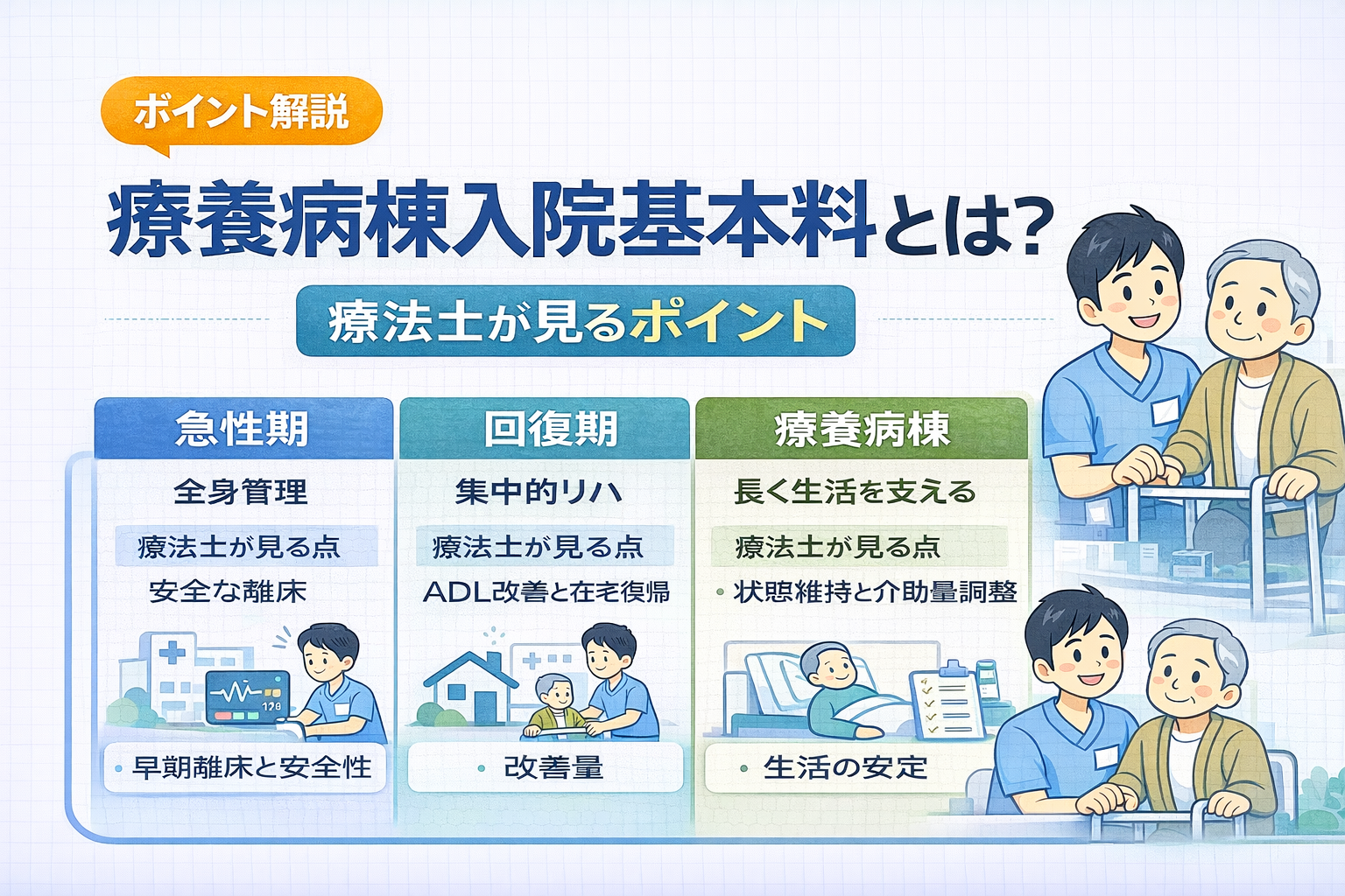本記事では、療養病棟入院基本料の全体像を療法士向けに整理し、慢性期病棟の役割、療法士が見るべきポイント、医療区分・ ADL 区分との関係をやさしく解説します。入院基本料全体の地図は、入院基本料とは?療法士向けに病棟機能から解説から先に見るとつながりやすいです。