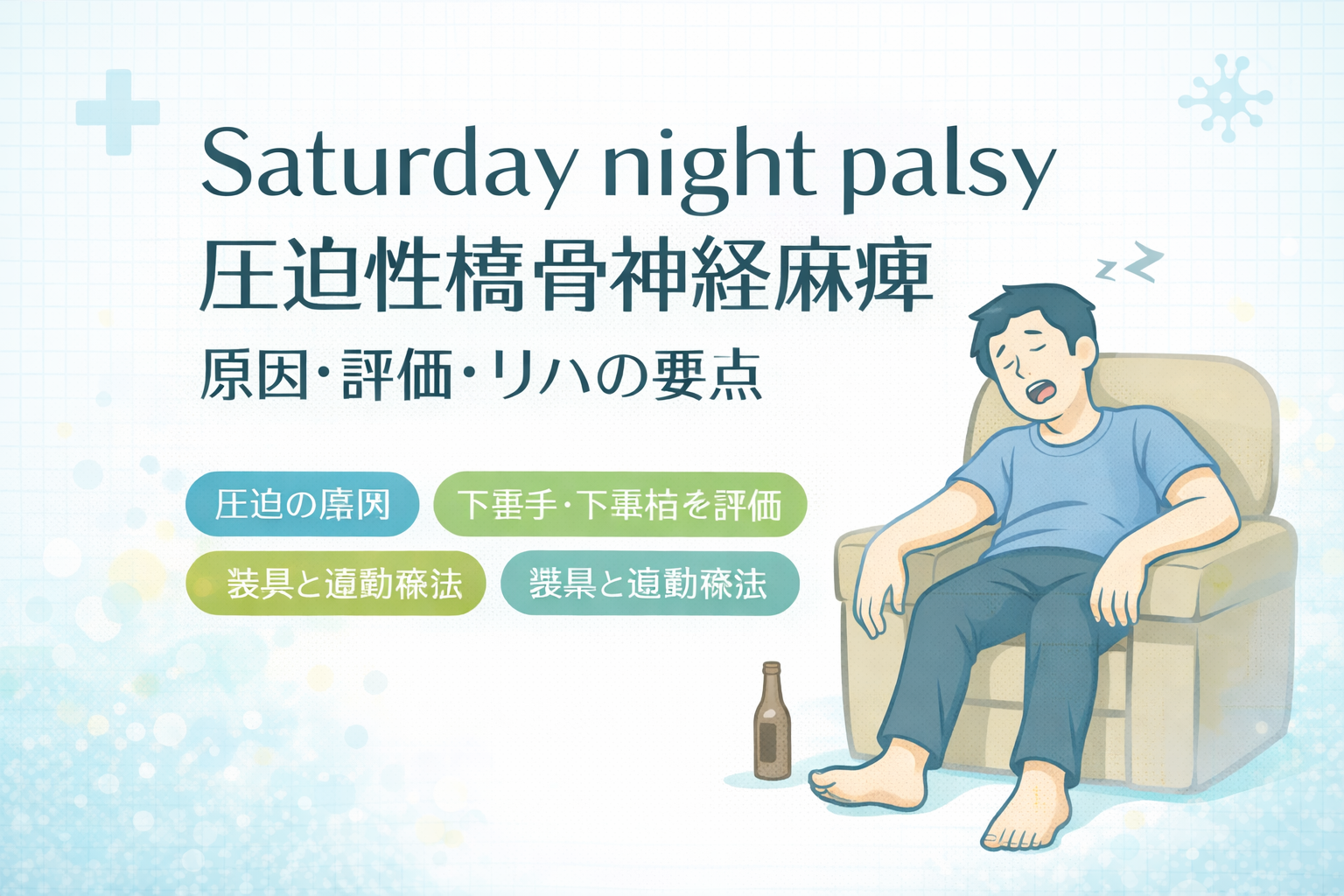 Saturday night palsy(圧迫性橈骨神経麻痺)は、睡眠中などに上腕部(橈骨神経)へ長時間の圧迫がかかり、起床後に「下垂手(wrist drop)」を生じる状態です。典型例は、飲酒後に椅子の肘掛けへ腕を掛けたまま眠る、腕を枕の下に入れて眠る、などです。