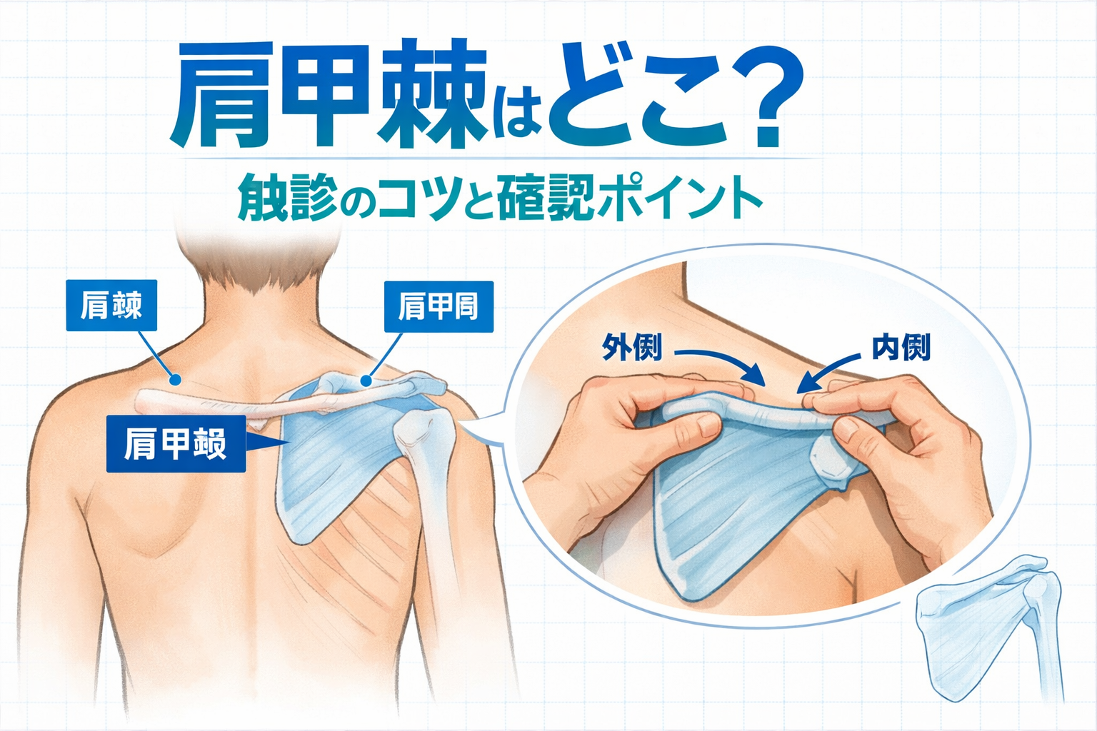 肩峰、肩甲骨内側縁、肩甲骨全体の位置関係とセットで覚えると整理しやすいです。肩後面を「肩峰 → 肩甲棘 → 肩甲骨内側縁」と流れで覚えると、触診の再現性が上がります。