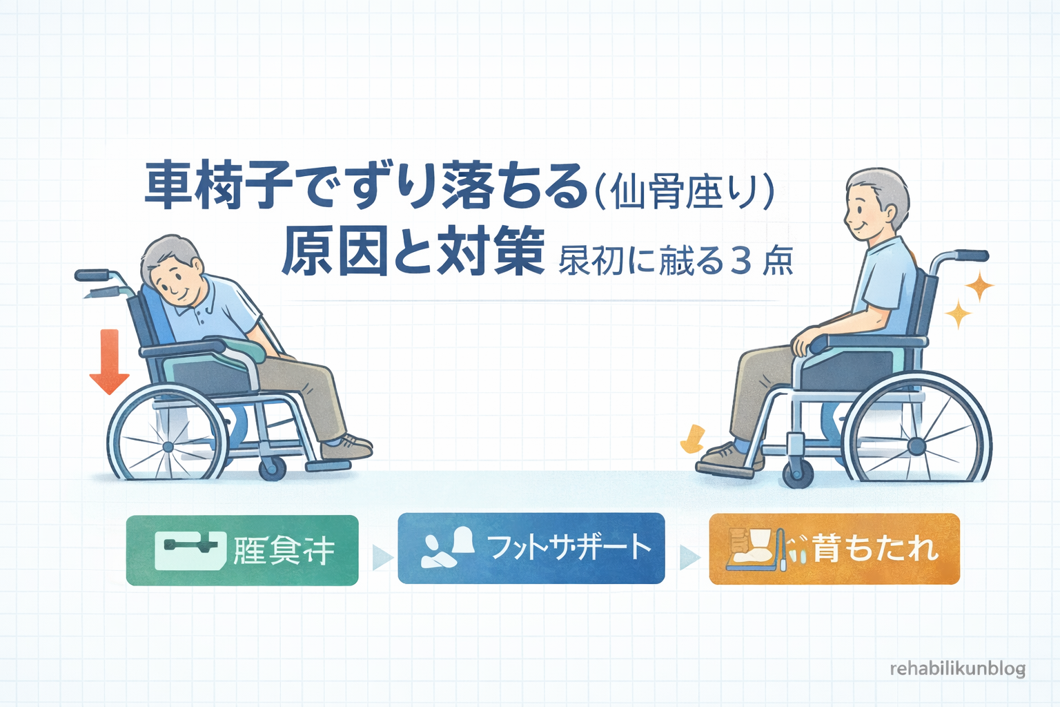 車椅子で「ずり落ちる(仙骨座り)」は、見た目の問題だけでなく、骨盤後傾の固定化せん断が増えやすく、褥瘡リスクや上肢活動の低下につながります。本記事は、現場で再現しやすいように最初に触る 3 点(座奥行・フットサポート・背もたれ)に絞って、原因→チェック→調整の順にまとめます。