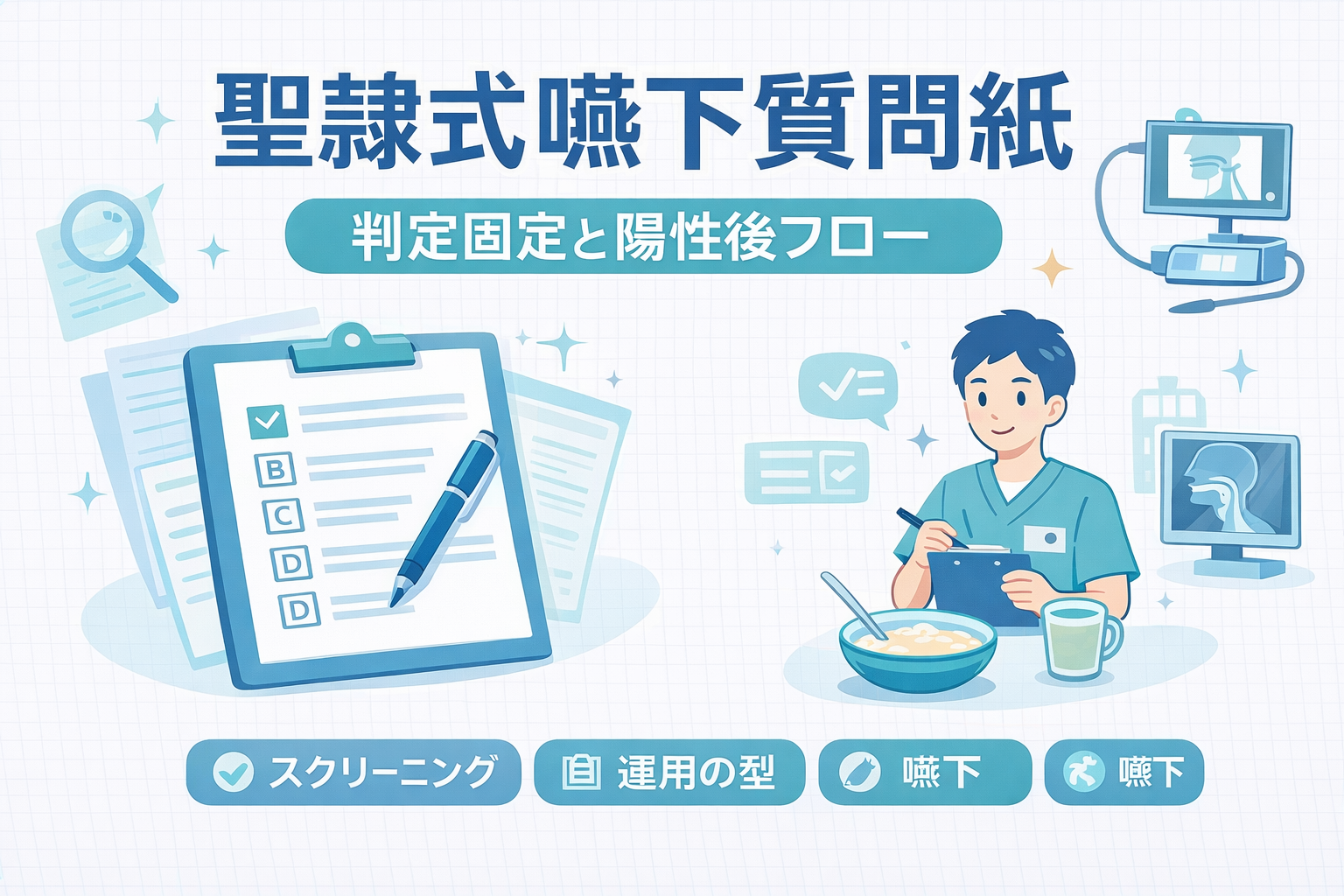 本記事では、点数の説明で終わらせず、誰が/いつ/どう判定し/陽性後に何へつなぐかまでを「運用の型」として整理します。嚥下評価の全体像(スクリーニング→客観評価→介入設計)を先に確認したい方は、親記事から入ると迷いが減ります。