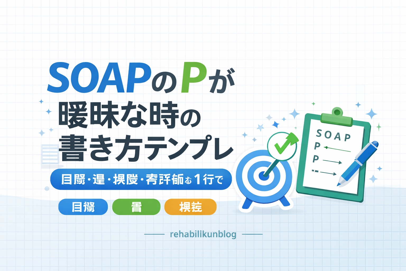 P( plan )は、目的の確認 → 具体的介入 → 量・頻度の設定 → 注意点(中止基準) → 再評価という臨床のリズムを、そのまま次回の設計図に落とし込むパートです。まずは「量・頻度」と「再評価指標」を 1 つずつ入れるだけでも、抽象語の P から抜け出しやすくなります。