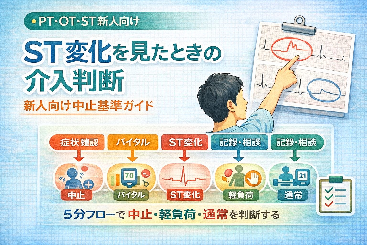 ST 変化の場面で新人が止まりやすい理由は、波形の詳細判読に時間を使いすぎて、当日介入の可否が決まらないことです。PT・OT・ST の実務では、診断の断定よりも、危険サインを見逃さず安全側で判断し、速やかに相談につなげることが重要です。本記事は、臨床で再現しやすい初動の型を示します。