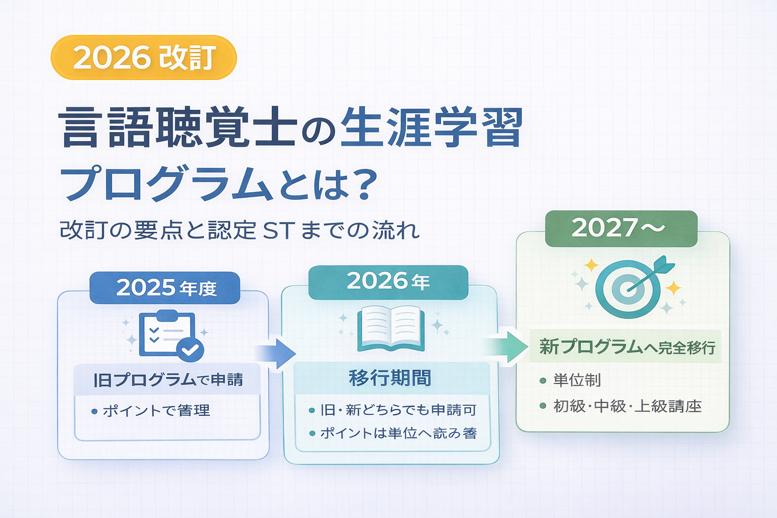 この記事では、言語聴覚士協会の生涯学習プログラムについて、旧プログラムと 2026 年度からの新プログラムを親記事として整理します。結論だけ先に言うと、2025 年度中は従来要件での申請、2026 年度は移行期間、2027 年度から新プログラムへ完全移行という流れです。制度を一気に覚えるより、今の自分がどの時期にいるかを確認するところから始めると整理しやすくなります。
