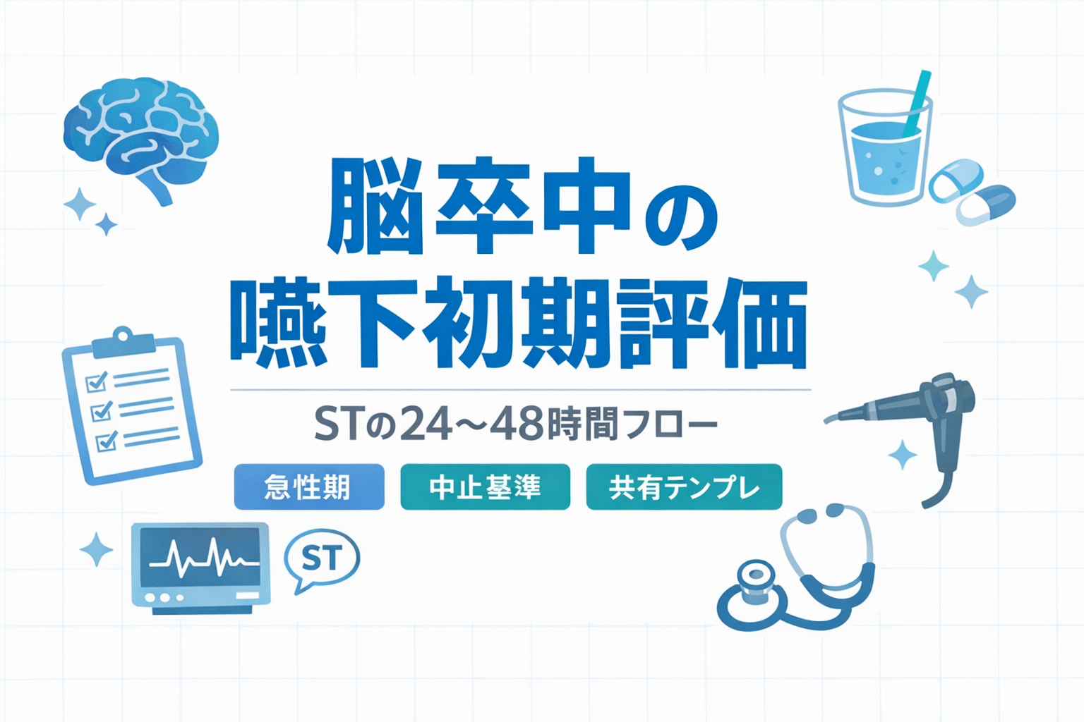 本記事は、成人の脳卒中急性期で、言語聴覚士( ST )が入院後 24〜48 時間に行う嚥下初期評価を「順番」と「中止基準」まで含めてフロー化します。狙いは、やみくもに試験摂食を始めるのではなく、意識・呼吸・姿勢・口腔環境・嚥下観察を積み上げて、安全に “小さく試す/止める”判断をブレなくすることです。