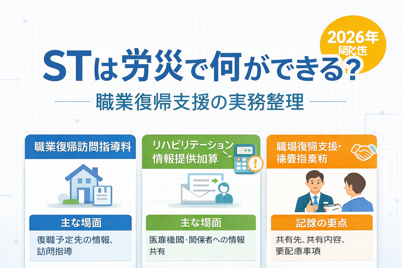 2026 年の労災改定で、医師の指示を受けて行う職業復帰訪問指導料、リハビリテーション情報提供加算、職場復帰支援・療養指導料の対象職種に ST が追加されました。