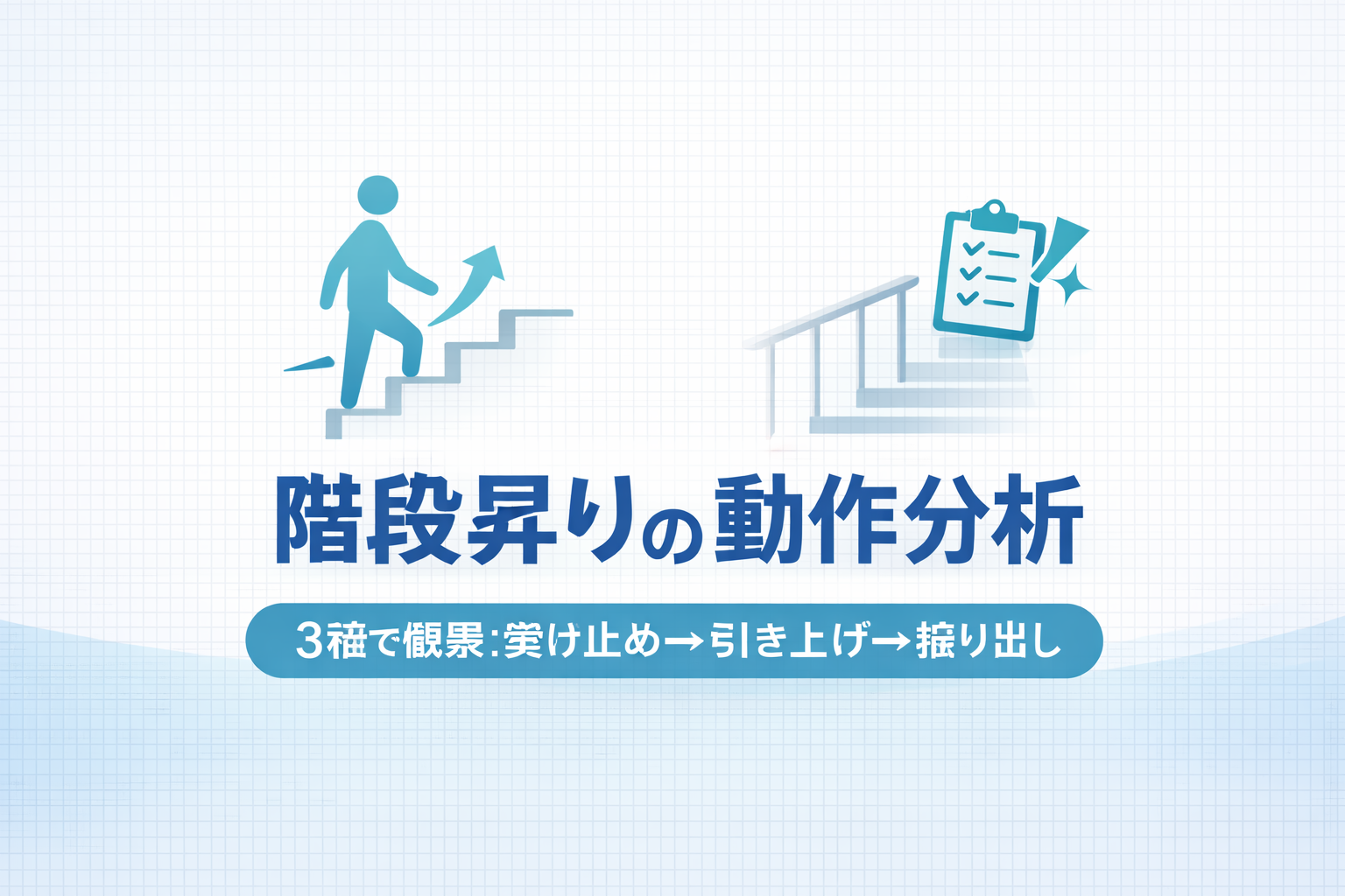 結論:階段昇り(昇段)は、①リード脚の荷重受け(受け止め)→②身体の引き上げ(pull-up)→③次段への振り出し(swing/step-through)の 3 局面で整理すると、観察→仮説→介入が一気に整います。新人のうちは「気になる見た目」を追うより、局面ごとに“見る場所”を固定して、同じ言葉で記録できる状態を先に作るのが近道です。