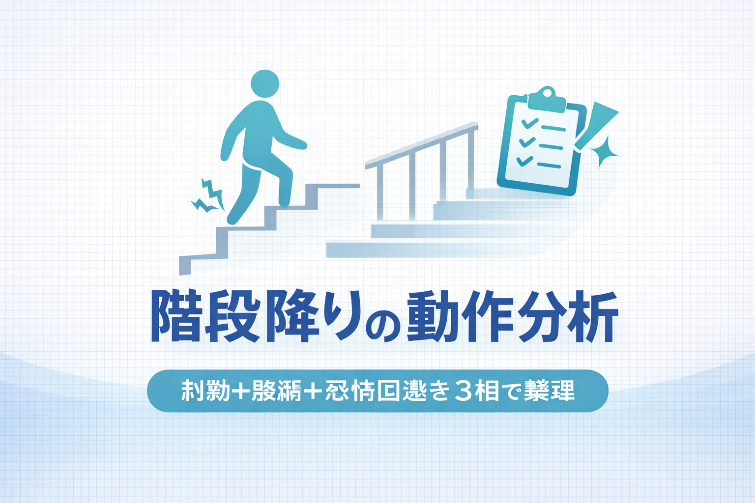 結論:階段降り(降段)の動作分析は、①準備(止まる・足位置)→②降ろす(制動:膝・股の遠心性)→③着地して受け止める(荷重受け)の 3 局面で相分けすると、新人でも「どこで破綻したか」を説明できます。特に降段は“下ろす局面”の制動で崩れやすく、膝痛・恐怖・手すり依存の理由が動作に出やすい課題です。
