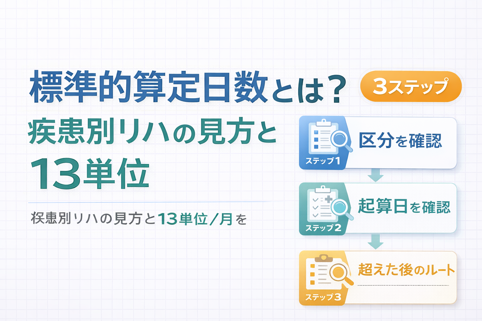 この記事では、標準的算定日数の意味、疾患別リハ 5 区分の日数と起算日、 1 日 6 / 9 単位、標準日数超え後の考え方、 1 月 13 単位の見方までを総論として整理します。まず区分全体を確認したい場合は、疾患別リハビリテーション料の総論記事から先に見るとつながりやすいです。