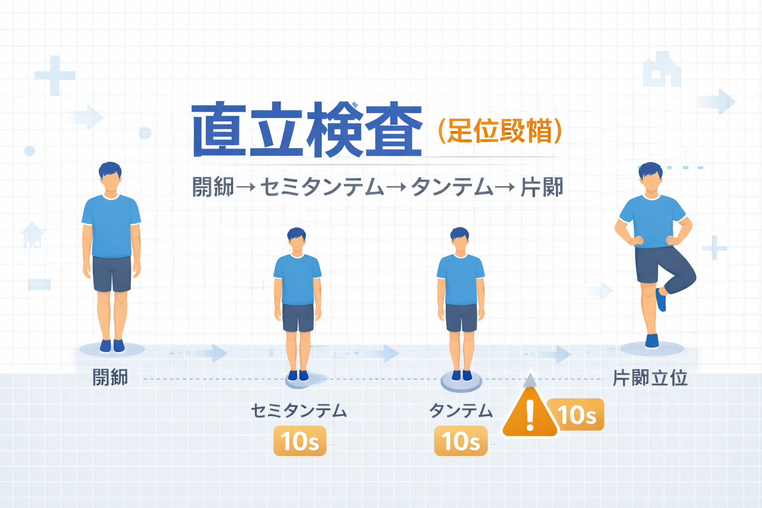 直立検査(足位段階)のやり方|閉脚→セミタンデム→タンデム→片脚の 4 段階