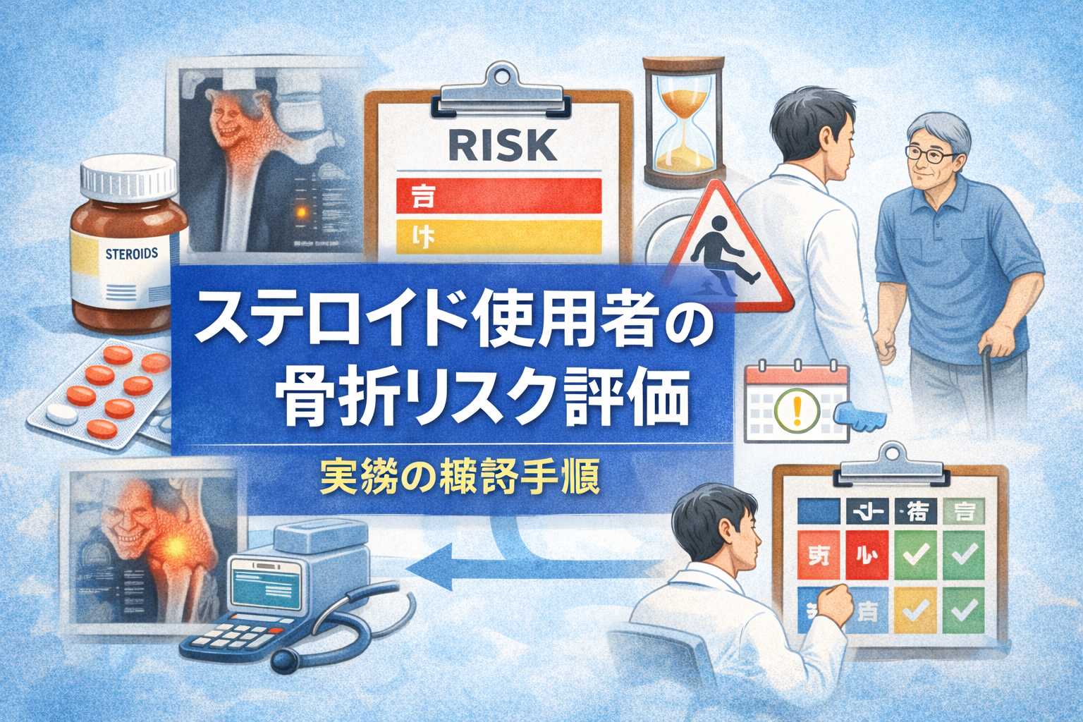 本記事では、ステロイド使用者に特化して、問診・薬歴確認・転倒評価・介入優先度・再評価の流れを実務向けに整理します。 骨折リスク評価の全体像は 親記事 で確認できます。
