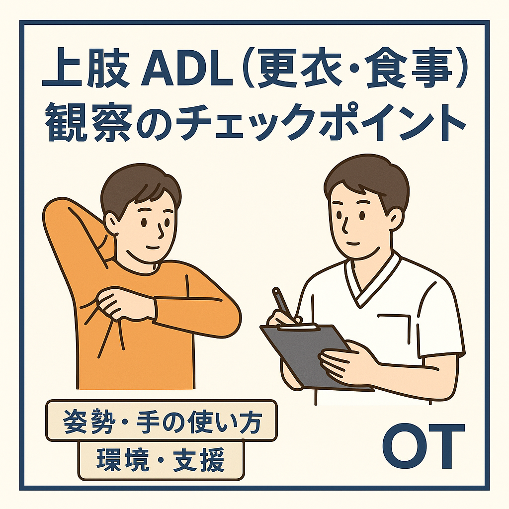 更衣や食事といった上肢 ADL の観察は、片麻痺上肢の機能評価と利き手交換の方針、環境調整の必要性をつなぐ「ハブ」の役割を持っています。「できた/できない」の二択ではなく、どの姿勢・手順・道具・支援の組み合わせなら、その人が一番安全かつ楽に作業できるのかを探ることが、作業療法士の評価の醍醐味だと言えます。忙しい現場でも、今日の記事で紹介したチェックポイントを 1 つずつ取り入れていくことで、観察の解像度と記録の説得力は少しずつ高まっていきます。