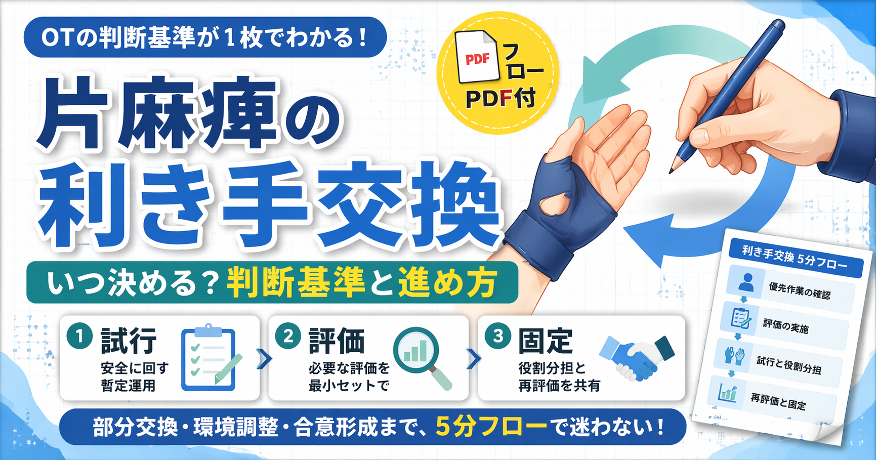 片麻痺の上肢リハで止まりやすいのは、「麻痺側をどこまで狙うか」と「非麻痺側でどこまで代償するか」がぶつかる場面です。利き手交換は、その衝突点を書字・食事・更衣などの生活課題に落とし込み、安全に回す暫定運用 → 期間を切った試行 → 固定の順で整理する意思決定として扱うと迷いが減ります。
