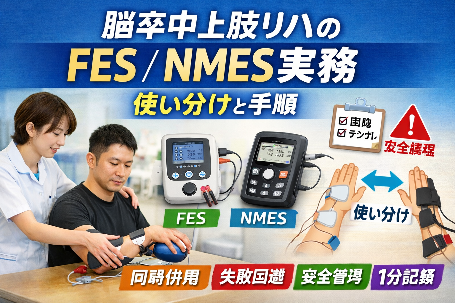本記事は、現場で迷いやすい「 FES と NMES の使い分け」「課題との同期」「やり過ぎの回避」「最小記録」を、実装順で整理します。設定値の細かな議論より先に、目的・タイミング・再評価軸を固定して、毎回の介入を積み上げる設計を優先します。