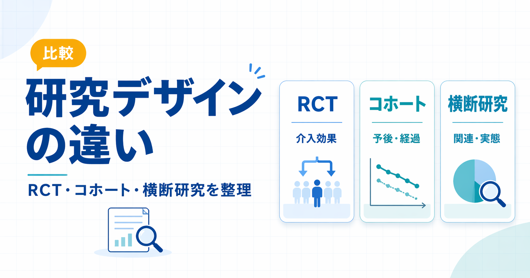 研究デザインは、論文の結論を正しく読むための入口です。RCT は介入効果、コホート研究は予後や経過、横断研究は関連や実態、症例対照研究はまれな事象、症例報告は仮説や臨床視点を得るときに役立ちます。