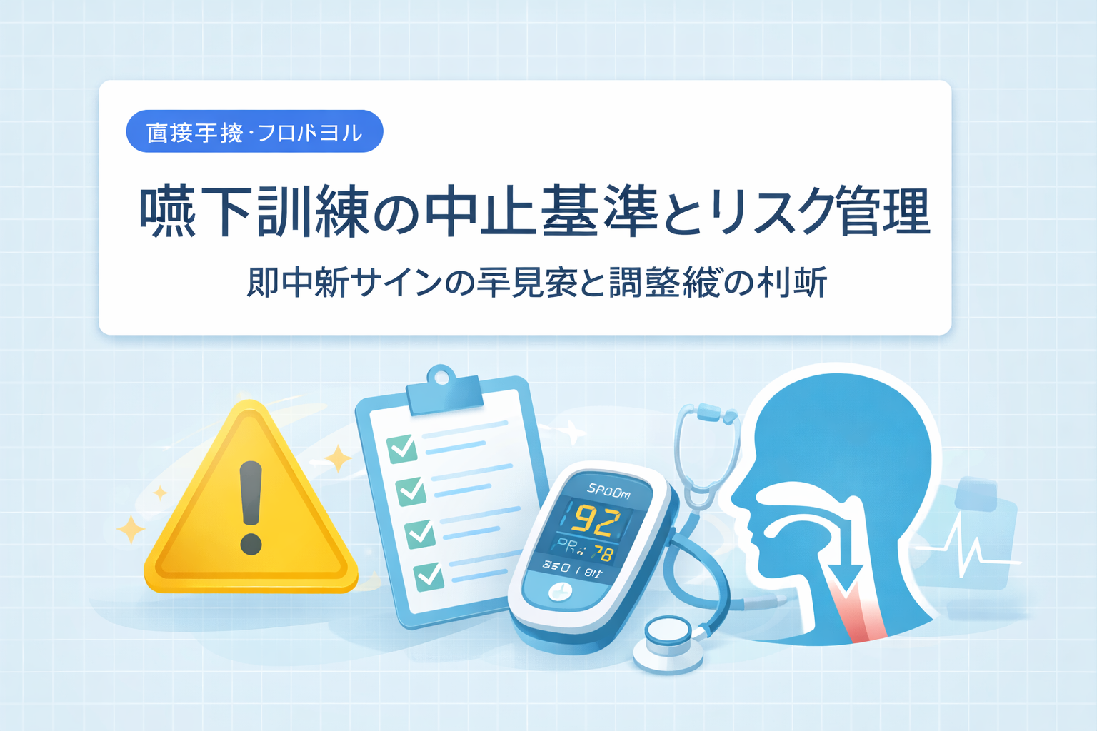 PT キャリアの全体像を 5 分で見る嚥下訓練(摂食機能療法)は「続けて良いのか」「いったん止めるのか」の判断が遅れると、リスク側に寄りやすくなります。そこで有効なのが、中止基準(止めどき)を先に固定しておく運用です。