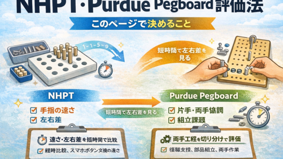 評価 NHPT・Purdue Pegboard 運用プロトコル(記録用紙) NHPT と Purdue Pegboard を同条件で測るための準備・手順・記録・解釈を 1 ページで整理。左右差と経時変化の見方、現場で使える日本語 A4 記録用紙(PDF)付き。 2026.01.21 評価