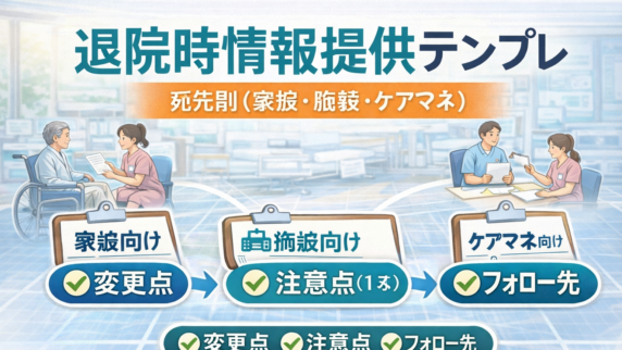 制度・実務 退院時情報提供テンプレ|宛先別(家族・施設・ケアマネ) 退院直前の変更が宛先に伝わらないと漏れます。家族・施設・ケアマネ別に「書くこと」を固定し、72 時間で最新化する運用と一枚テンプレを整理。 2026.02.22 制度・実務