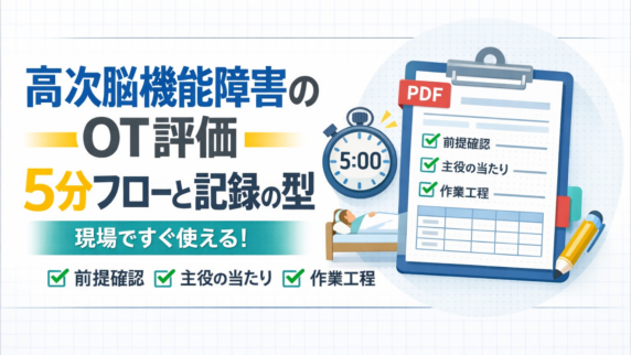 評価 高次脳機能障害のOT評価|5分フローと記録 高次脳機能障害のOT評価を、前提条件→主役の当たり→作業工程→条件差→同条件再評価の5分フローで整理。USN・注意・遂行を混ぜずに見て、記録へ落とすコツと配布PDFをまとめました。 2026.04.09 評価