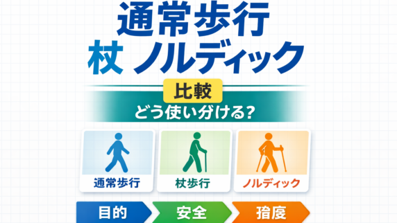通常歩行・杖・ノルディックは、目的 → 安全 → 強度で選ぶと迷いにくくなります。比較表・ 30 秒フロー・ PDF で、次に選ぶ歩行形態が決まります。