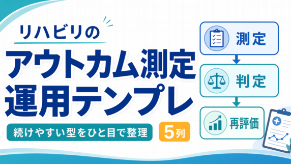 評価 リハビリアウトカム測定テンプレ|運用の型と記録例 リハビリのアウトカム測定を、指標・初回値・目標値・再評価日・次アクションの5列で回す実装記事です。よくある失敗、5分チェック、記録例まで整理します。 2026.04.24 評価