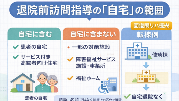 制度・実務 退院前訪問指導の「自宅」の範囲|サ高住・施設・転棟例【回復期リハ】 回復期リハ強化体制加算における、退院前訪問指導の「自宅」の範囲を整理。サービス付き高齢者向け住宅を含むか、除外施設は何か、他病棟で実施後に転棟した症例をどう扱うかまで、2026 年の疑義解釈をもとに解説します。 2026.04.11 制度・実務