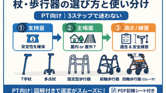 臨床手技・プロトコル 杖・歩行器の選び方と使い分け【 PT 向け 】図解付き 杖・歩行器の選び方を PT 向けに整理。図解、早見表、高さ調整、練習手順、PDF 記録シートまで 1 ページで確認できます。 2026.03.30 臨床手技・プロトコル