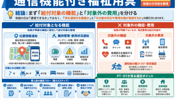 制度・実務 通信機能付き福祉用具|位置情報・故障通知はどこまで対象? 通信機能付き福祉用具について、給付対象となる機能、対象外の機能・費用、歩行器・車いす・特殊寝台での考え方、 PT ・ OT が見る選定ポイントを整理します。 2026.04.07 制度・実務