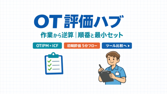 評価 OT 評価ハブ|作業から逆算する順番と最小セット OT 評価の順番と最小セットを 1 ページで整理。困りごと別に各論へ最短で飛べる索引ハブです。OTIPM × ICF、初期評価 5 分フロー、ツール比較もまとめて回遊を強化。 2026.01.28 評価