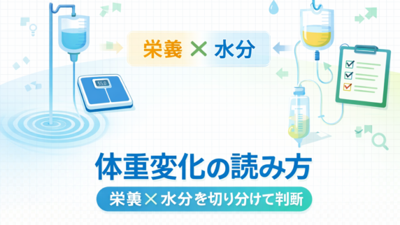 体重は栄養だけでなく水分・排泄・治療(点滴/利尿)で動きます。%体重変化の見方、短期変動=水分の可能性、浮腫/脱水の確認ポイントと記録のコツを整理します。