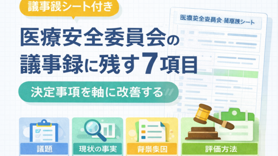 制度・実務 医療安全委員会の議事録に残す 7 項目 医療安全委員会の議事録で残すべき項目を、インシデント報告から現場改善へつなげる視点で整理。決定事項、担当、期限、評価方法、現場への戻し方まで実務目線で解説します。 2026.04.07 制度・実務